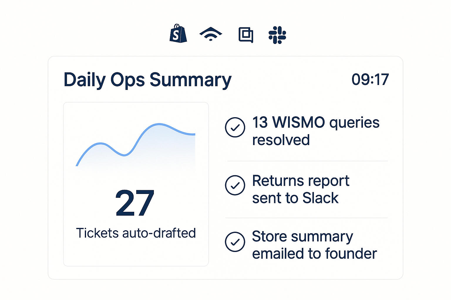 Clear daily snapshots of orders, support and key metrics, without hunting through dashboards or exporting another CSV.